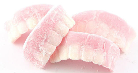These are the good old favourite milk teeth. These are strawberry and vanilla flavoured gums. They are shaped just like teeth.